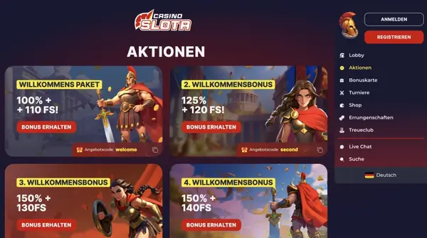 Neue Kunden können mit einem dreistufigen Einzahlungsangebot starten, mit derselben Umsatzregel über alle Stufen. Einzahlung 1 bringt 100% bis zu €300 plus 80 Freispiele (min. €20, Umsatz 45x). Einzahlung 2 ergänzt 55% bis zu €500 plus 120 Freispiele (min. €20, Umsatz 45x). Einzahlung 3 bringt 100% bis zu €300 plus 55 Freispiele (min. €20, Umsatz 45x). Derzeit listen wir keinen Slota Casino Bonus ohne Einzahlung für Deutschland; Angebote erfordern eine qualifizierende Einzahlung.