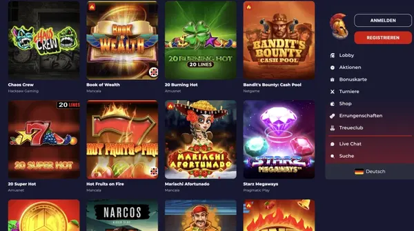 Unsere Bibliothek umfasst 8.259 Titel aus Slots, Tischspielen, Live Casino, Video Poker und Crash Games, mit bekannten Studios wie Pragmatic Play, Evolution Gaming, Play'n GO und mehr. Du kannst bei vielen Spielen im Demo-Modus starten, um Features kennenzulernen, und dann auf Echtgeld wechseln, wenn du bereit bist. Slota unterstĂĽtzt auĂźerdem mehrere Sprachen, darunter Deutsch, sodass wichtige Seiten leichter zu lesen sind. Nutze die Tabelle unten, um die wichtigsten Fakten zu prĂĽfen, bevor du dich registrierst.